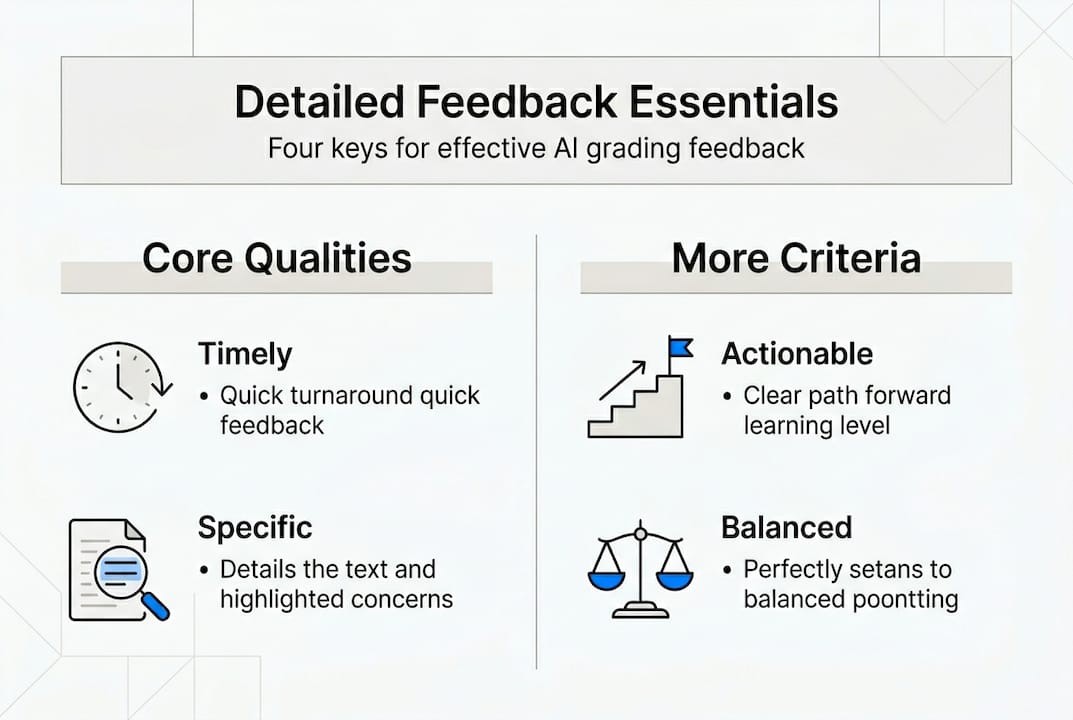Not all feedback is created equal. A grade and a single sentence of commentary may tell a learner they fell short, but it rarely tells them how to do better next time. Genuinely detailed feedback has four consistent characteristics: it is timely, specific, actionable, and balanced.