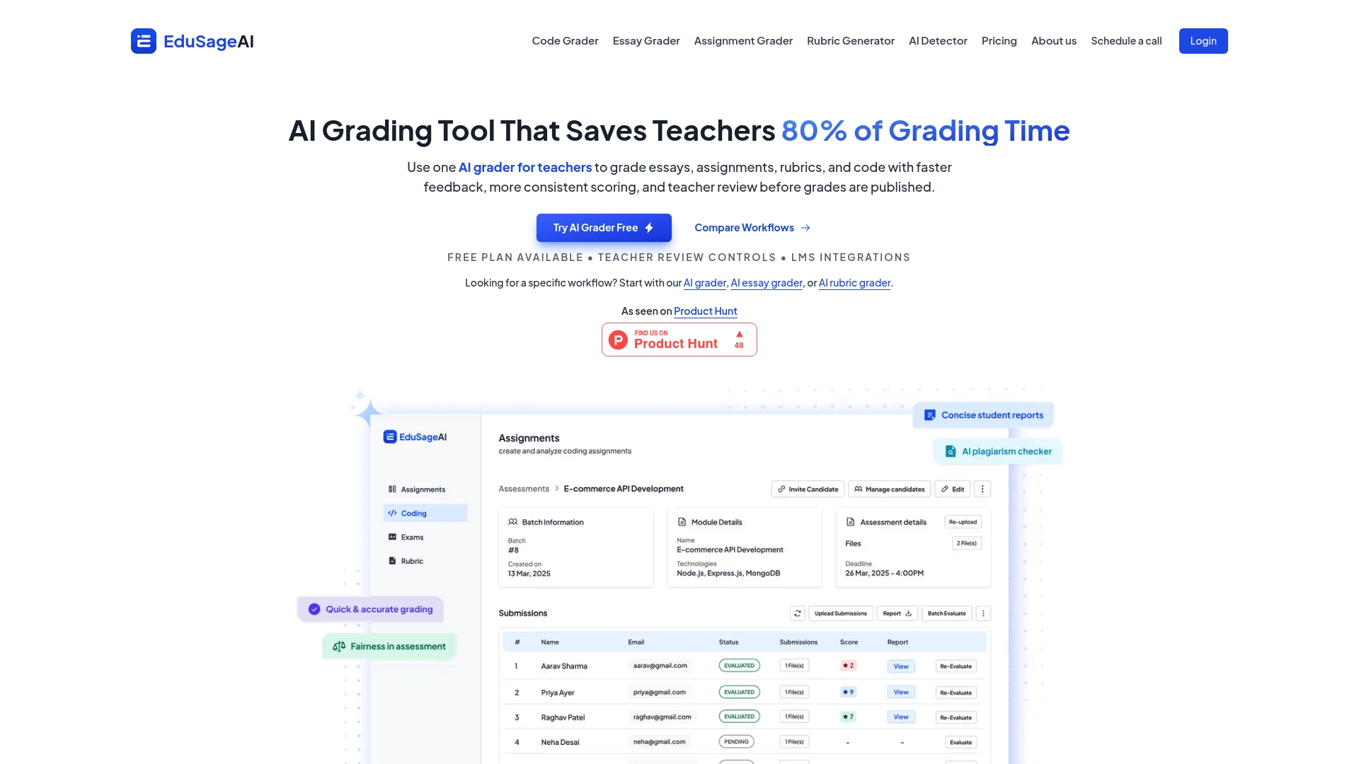 EduSageAI is an AI powered grading platform built to reduce marking time while keeping teachers in control. It offers fast feedback, consistent scoring across essays and code, and tools that support academic integrity.