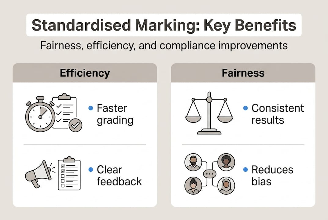 Standardisation supports fairness, equity, and regulatory compliance by establishing consistent expectations and reducing bias. This is particularly important in diverse cohorts where unconscious bias can otherwise influence grading decisions in subtle ways.